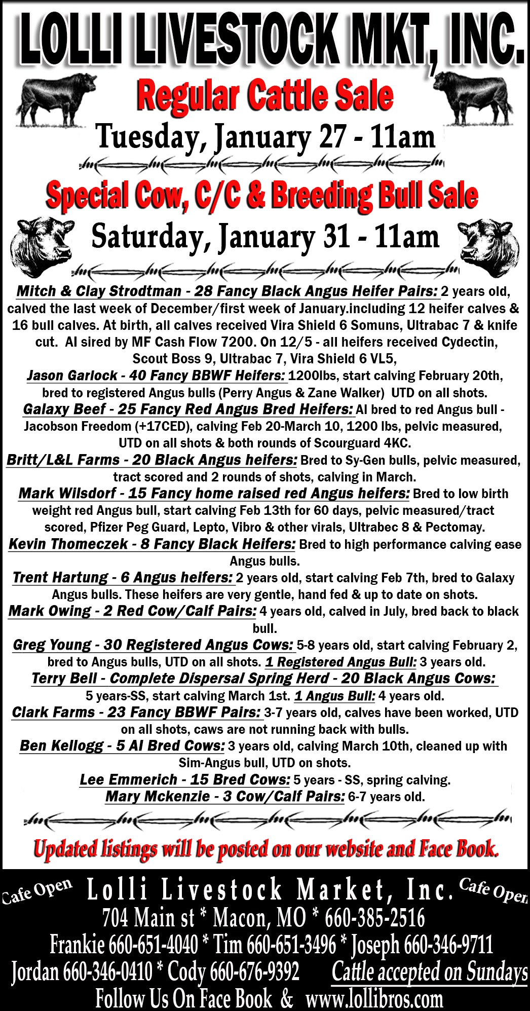 SATURDAY, January 31 - Special Cow, Cow/Calf & Breeding Bull Sale - 11am
