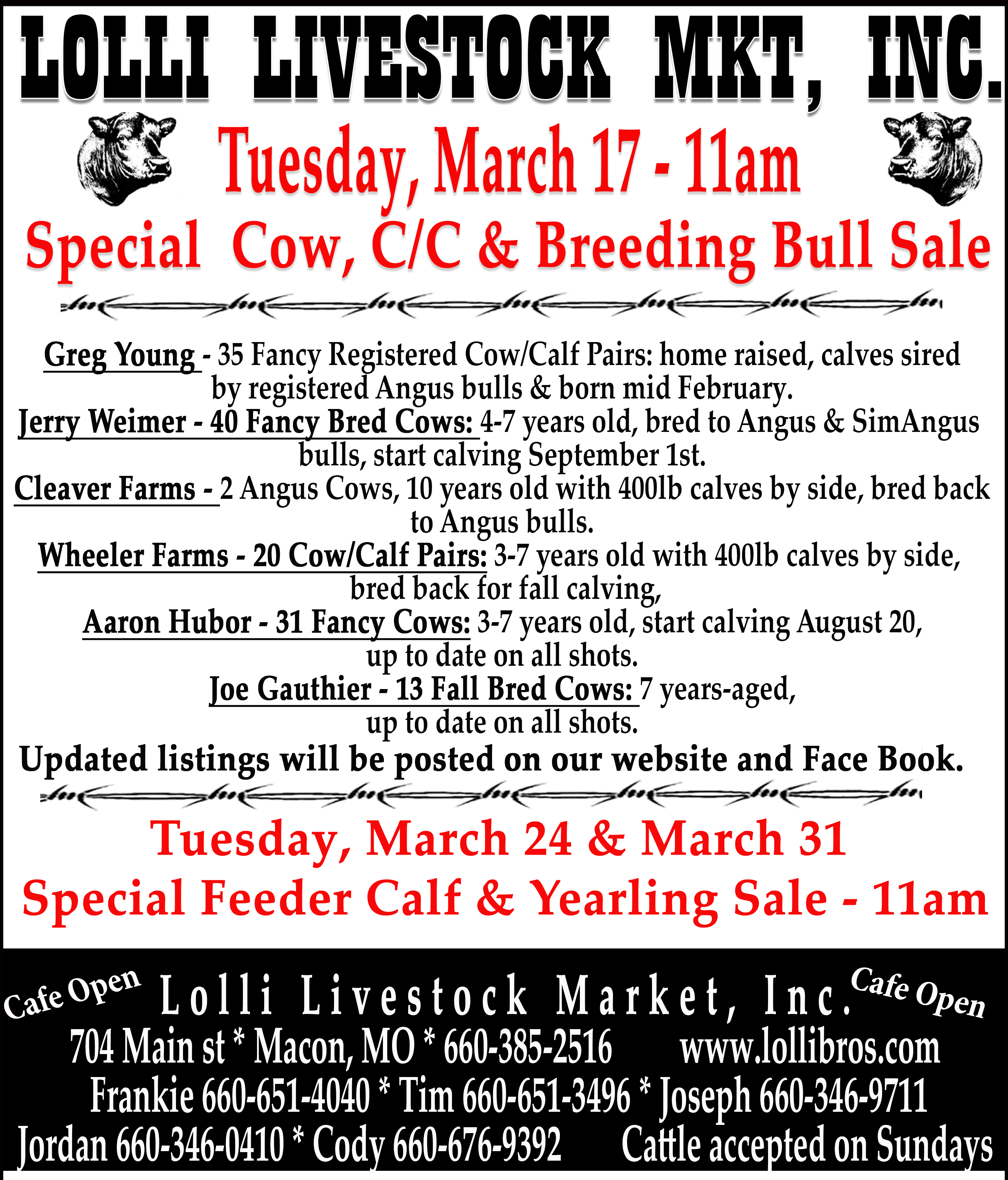 Tuesday, March 17th - Special Cow, C/C & Bull Sale - 11am