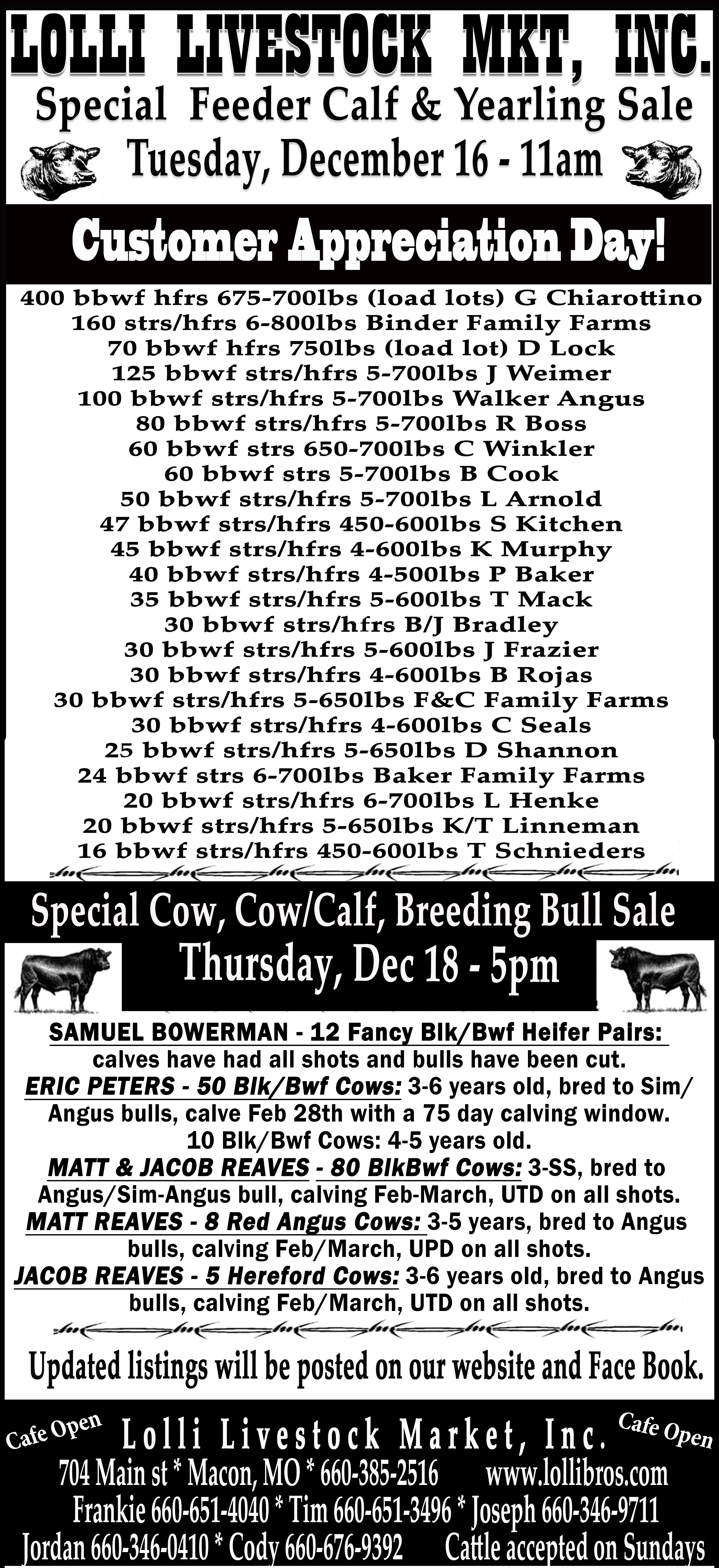 December 16 - Special Feeder Calf & Yearling Sale - 11am