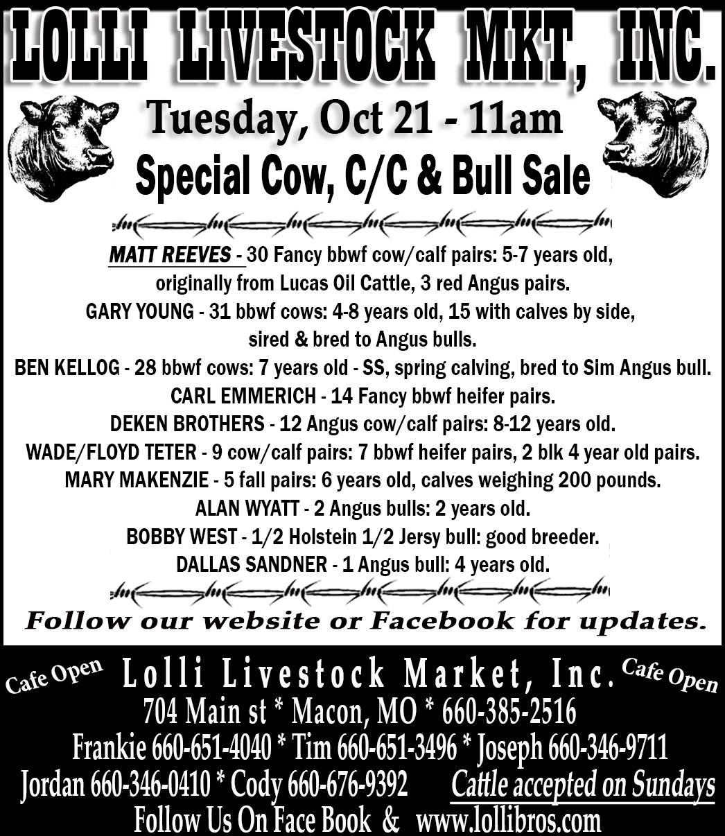 Oct 21 - Special Cow, C/C & Breeding Bull Sale - 11am