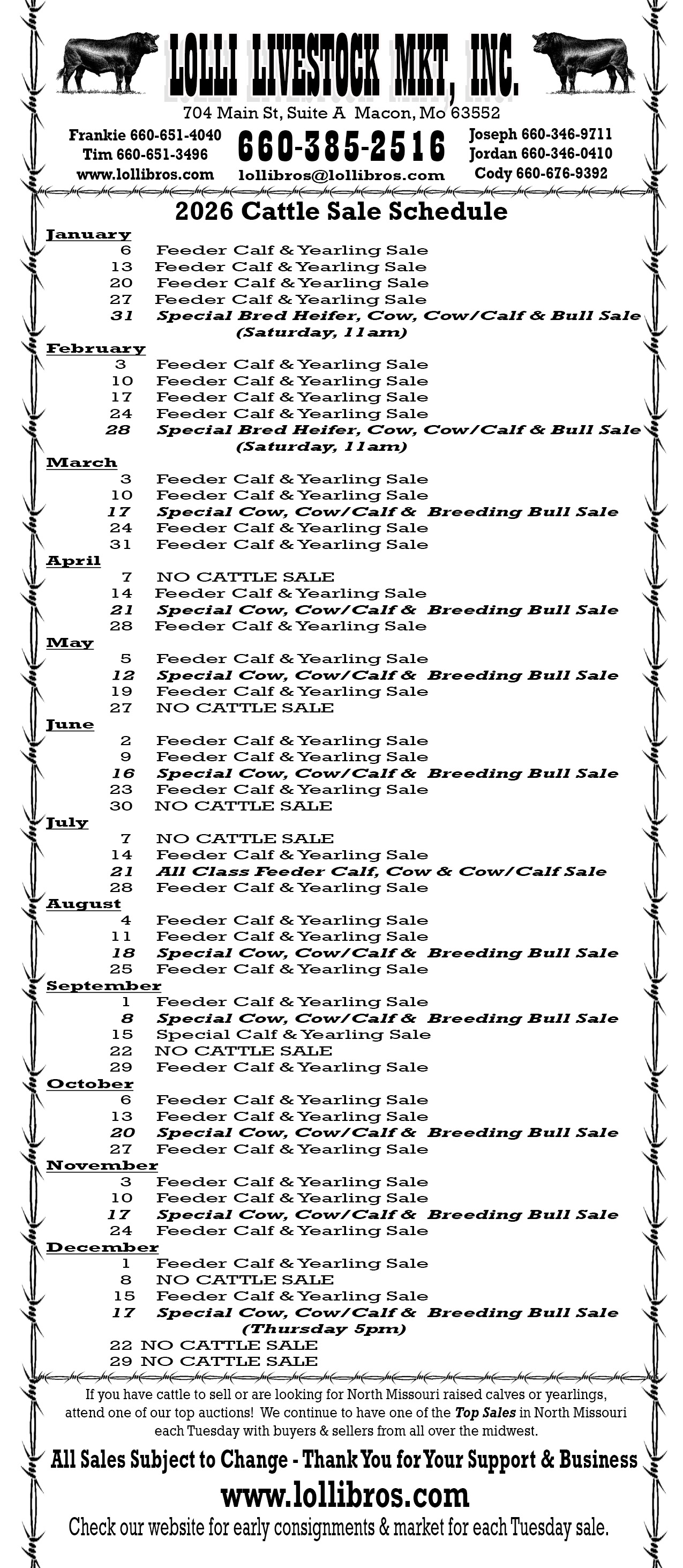 2026 Cattle Schedule