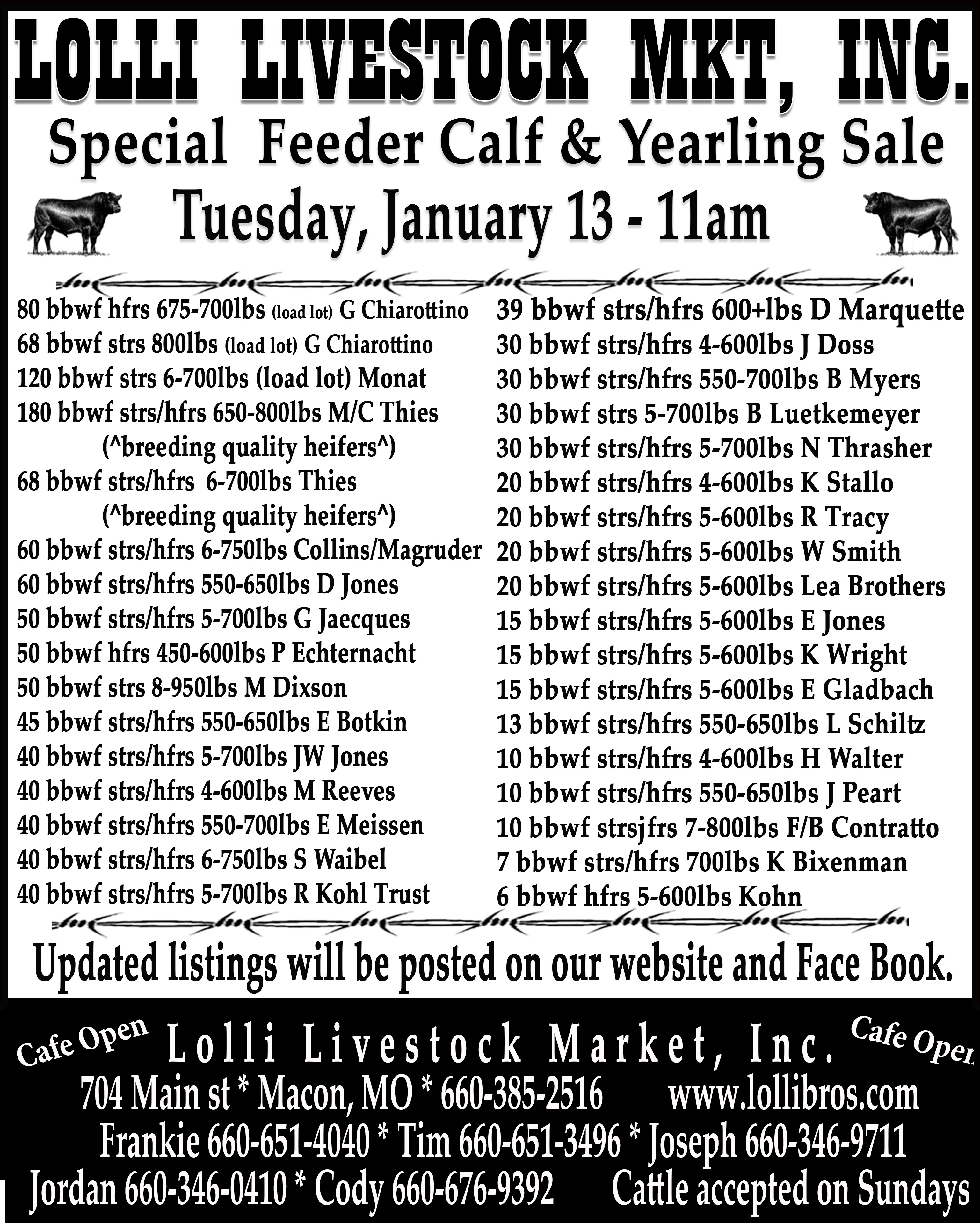 Tuesday, January 13th - Special Calf & Yearling Sale - 11am
